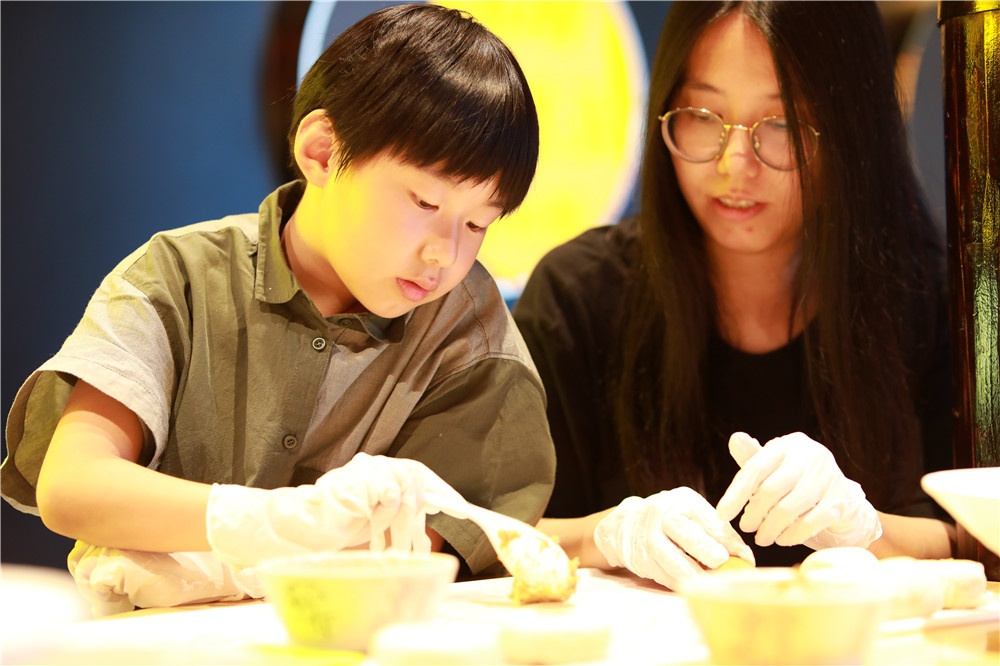 一個(gè)鮮肉月餅最重要的是酥皮部分,首先將豬油、水與面粉按比例調(diào)和,再經(jīng)過(guò)反復(fù)攪拌、揉面、折疊“千錘百煉”后方可成為一塊合格的餅皮,然后包裹鮮肉揉搓成球,輕輕按壓敲上月餅專(zhuān)屬“紅章”進(jìn)行烤制,二十分鐘后香噴噴的鮮肉月餅便新鮮出爐了。小朋友們津津有味品嘗著自己的勞動(dòng)成果,還和現(xiàn)場(chǎng)工作人員分享,臉上洋溢著自豪開(kāi)心的笑容。