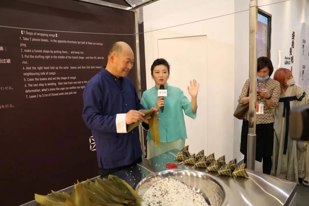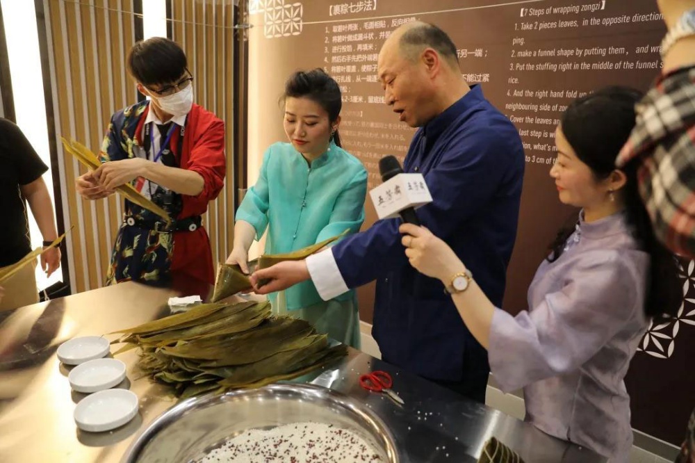 非物質(zhì)文化裹粽技藝傳承人、裹粽大師胡建民在粽藝長廊展廳現(xiàn)場展示了深厚扎實的裹粽技藝,并帶領現(xiàn)場美食達人和特邀消費者代表一起學習裹粽。大家都忍不住驚嘆,一個小小的粽子,學問真不少。