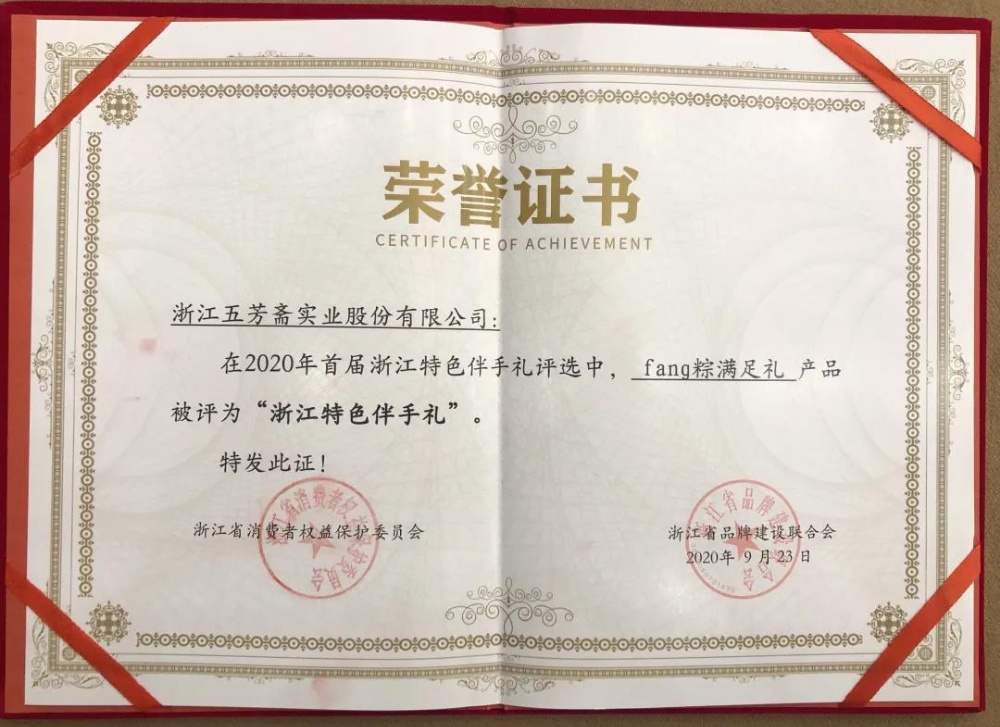 本次發(fā)布會,浙江省市場監(jiān)督管理局、浙江省消費(fèi)者權(quán)益保護(hù)委員、浙江省品牌建設(shè)聯(lián)合會等相關(guān)領(lǐng)導(dǎo)親臨現(xiàn)場,為本次評選中獲得“首屆浙江特色伴手禮”稱號的產(chǎn)品隆重加冕。五芳齋選送的fang粽滿足禮也獲得了該項(xiàng)殊榮。