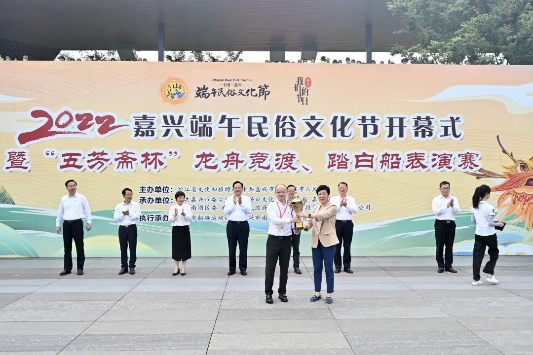 6月2日上午,由浙江省文化和旅游廳、中共嘉興市委、嘉興市人民政府共同主辦的2022嘉興端午民俗文化節(jié)開幕式暨“五芳齋杯”南湖龍舟競渡、踏白船表演賽,在嘉興西南湖火熱開場。
